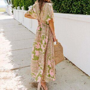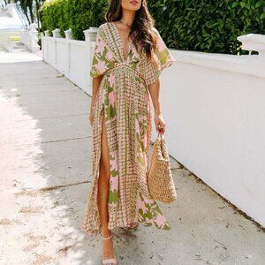 Women's Floral Boho Maxi Dress Deep V Neck Ruffle Hem Casual Elegant