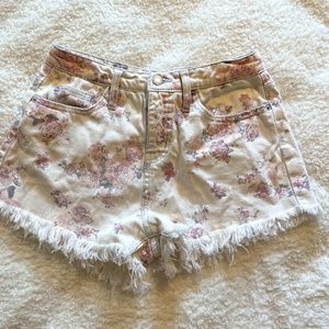 Brand: Mossimo (originally purchased at Target) - Size: Small (approximately 27 inches) - Color: White with pastel flowers - Material: Stretchy denim - Condition: Never worn - These SUPER cute real denim shorts are white with printed floral patterns of pastel colors. Works perfectly for any summer wardrobe on the feminine side. Works really well with any neutral colored top. Selling because they no longer fit me. Contact me with any questions! :)
