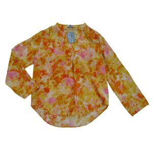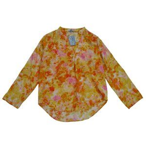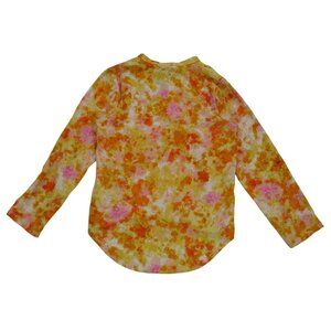 This long sleeve top features an artistic blend of orange, yellow, and pink tones, creating a lively abstract floral design. It is crafted with lightweight rayon and nylon fabric, offering a breezy and comfortable fit. The buttoned sleeve detail adds a touch of elegance, making it a stylish wardrobe addition.