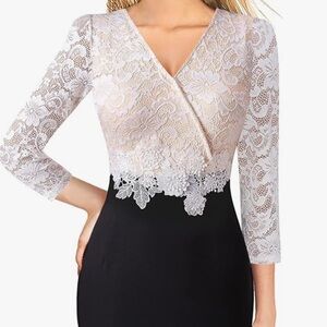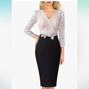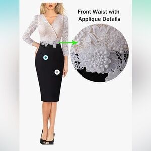 Womens Floral Lace Applique Waist V Neck 3/4 Sleeve Colorblock Bodycon Dress