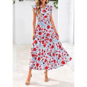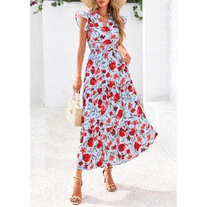 Women's Floral Midi Dress Summer Boho V Neck Cap Sleeve Ruffle Beach