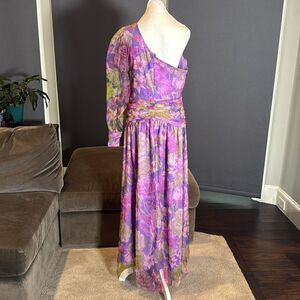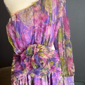 Women’s Purple Floral One Shoulder Lightweight Summer Dress with Long Leg Slit and side Cut Outs. The Sleeve is sheer and has a button cuff