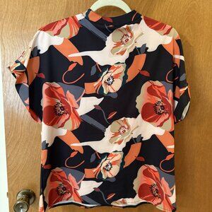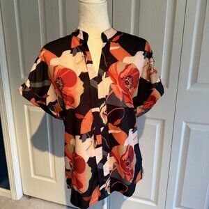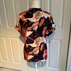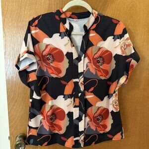 This women's blouse in size medium features a floral print with a notched V-neckline and short sleeves, making it a perfect choice for casual summer wear. Made from a blend of polyester and spandex, this pullover blouse is easy to care for with machine washable fabric. It is versatile for travel, casual outings, or business meetings, showcasing a colorful multicolor floral design that is ideal for spring, summer, or fall seasons. Designed with a regular fit in a basic style, this blouse is a stylish and comfortable addition to any wardrobe. Excellent Condition - Only Worn Once. Shipped with USPS. From a smoke free and pet free home.