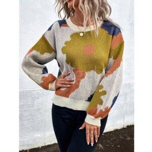 Floral Print Pullover Knit Sweater Multicolor Crew Neck Long Sleeve