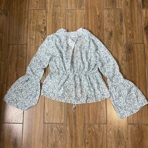 Women's Floral Print Ruffle Topper Tie-Waist Bell-Sleeve Top, Blue, S