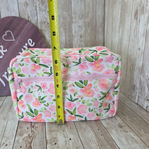 This is a new, unused cosmetic bag without tags or box. The bag is made of a floral-patterned fabric with pink flowers and green leaves on a white background. It has a pink zipper closure.. There are no visible imperfections. The brand and model are unknown.