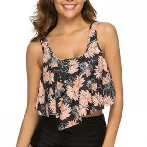 Women’s Floral Print Tankini Top Black Pink Bathing Suit Adjustable Top Sz M