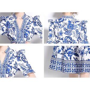 Women's Floral Print V-Neck Button Up Short Puff Sleeve Midi Dress