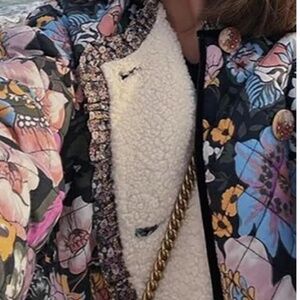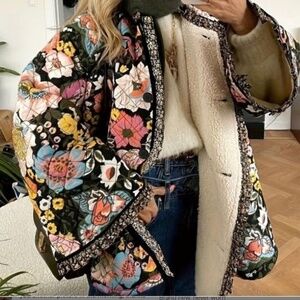 Perfect for Spring and those cooler Summer evenings comes this Floral Quilted button front Jacket in sz medium. Oversized fit, perfect for layering. Features an allover floral print in multi combo, bell sleeves,button front closure, side pockets, fully lined super soft Sherpa, contrast floral ruffle trim along neckline as well as down front along hem and sleeves. #Free People #Anthropologie#Johnny Was for similar look and vibe. Black piping detail. Fabric 70% cotton, 20% polyester 10% spandex. Measurements bust flat 26.5” length 26.5”