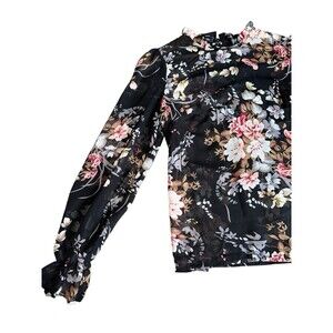 Floral Sheer Blouse Black Long Sleeve Ruffle Neck Romantic