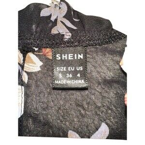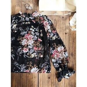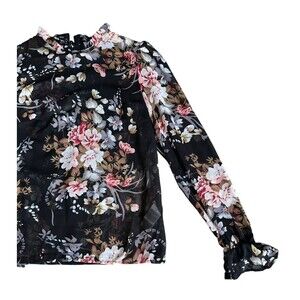 Womens Floral Sheer Blouse Black Long Sleeve Ruffle Neck Romantic Top Small