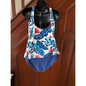 Womens Floral Tankini Swimsuit Set S Blue & White Nylon/Spandex