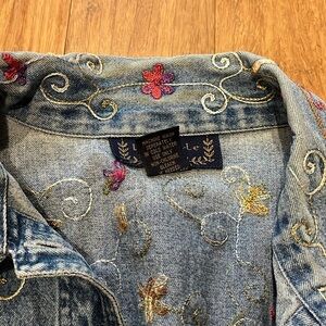 Stylish denim jacket with vibrant floral embroidery. Perfect for adding a pop of color to your outfit.