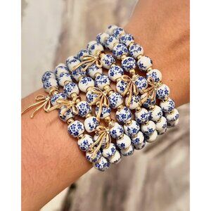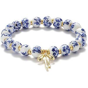 This handmade beaded bracelet is a perfect blend of elegance and charm. Featuring painted floral porcelain beads, 18K gold-plated spacers, and an 14K gold-plated bow charm with a delicate crystal accent, all strung on a strong double elastic cord, this bracelet embodies timeless beauty with a modern touch.