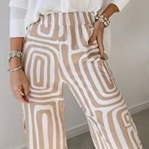 Women’s Flowy Palazzo Pants Sz M Tan And White Geometric Pattern With Pockets