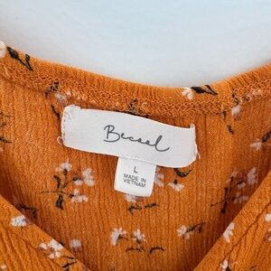 Delicate floral print on a burnt orange fabric and adjustable spaghetti straps