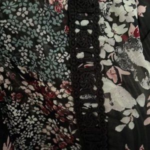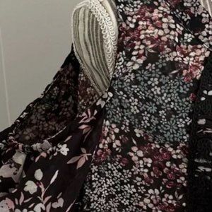 Sheer fun and blousy top. Backless with floral pattern. Black lace detail on the front cold shoulder style with small frilly, fluttery sleeves. Small key hole in front neck line. Back ties with larger square key hole shape. Like new condition. Materials tag was cut to avoid irritation/visibility (sheer).
