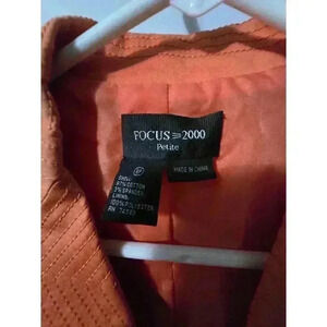 This is a pre-owned Focus 2000 Petite women's blazer in a bright orange color. It is made of a cotton blend fabric with a slight sheen. The blazer features a classic notched collar, a tie ribbon closure, and long sleeves with decorative stitching at the cuffs. There is a ribbon tie at the waist. The blazer is in good condition with no visible tears or stains. The label indicates the size is 6P, the fabric is 97% cotton, 3% spandex, and the lining is 100% polyester. The item is made in China. The measurements are approximately 17 inches across the shoulders, 18 inches across the chest, 24 inches in length, and 23 inches in sleeve length.