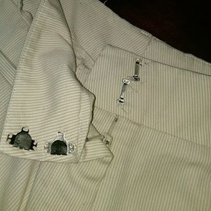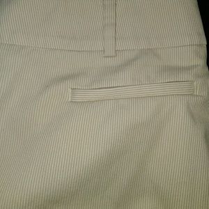Cream dress pants with tan stripes. Concealed button. Nice smooth front pockets. No back pockets.