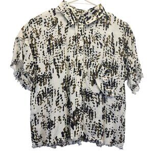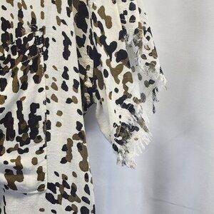 Lightweight and breathable, this abstract jungle dot shirt offers a stylish edge with its frayed hem and button-front design.