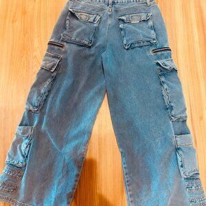Womens Forever 21 Cargo Jeans Size 29, in great condition. All zippers work. Multiple cargo and zipper pockets, barely worn, washed medium blue denim. Denim is thick and soft. Reinforced inseam. Baggy fit, slightly flared leg.