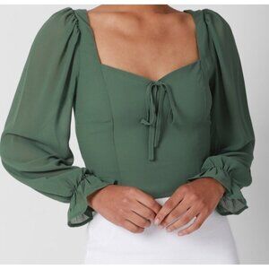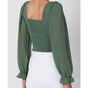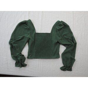 Women’s Forever 21 Green Sheer LS Rouched Back Cropped Blouse Square Neck Sz M