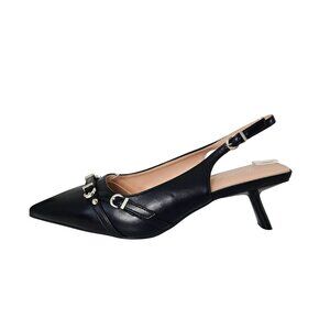 These black slingback kitten heels blend sophistication with charm. The pointed toe and buckle accents evoke timeless elegance, while the adjustable strap ensures comfort. Ideal for elevating an outfit, they combine style and practicality effortlessly.