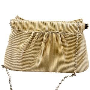 Beautiful formal handbag or clutch. It has a pleated fabric in a metallic silver color, giving 70s vibes. It has a chain strap to use it over the shoulder or hide it inside for a clutch-style bag. Perfect for the holiday parties or a formal event like a wedding or prom.