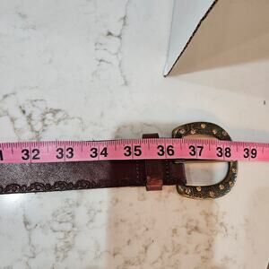 Add a touch of vintage charm to your outfit with this beautiful Fossil belt! This women's belt features genuine leather with a unique floral design, adorned with sparkling rhinestones for a touch of glamour.