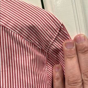 This is a very high quality tailored cotton blouse with gold embroidery at the collar and cuffs The button panel is hidden there is one tiny imperfection on the left shoulder It is shown in the photograph but is so small it’s almost imperceptible Would be really cute for an OU, Ohio State, Arkansas, Georgia game