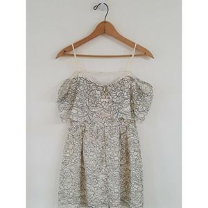 Womens Franchesca's Lacy Ivory & Black Off the Shoulder Spring Short Dress. This beautiful Franchesa's Closet dress has an etherial fairy princess quality to it! :) This dress is ivory and black lace from shoulder to seam. The style is off the shoulder with little cream spaghetti straps as well. The dress cinches in a little bit under the rib cage and flows out towards the bottom seam. The dress is easy to get on and off with its hiden zipper in the back.This used garment is in great conditon. It has no stains, tears, pilling, or holes. The color of the fabric is vibrant and beautiful. This little dress will be perfect for a spring daytime event or party. Dont hesistate to ask questions or make me an offer. Thanks! Sara