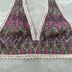 Good condition - Women’s Free People Boho Patterned Lace Halter Bralette Top. Has hook and eye closure with 3 settings. Colors: purple, pink, cream, brown, and gold. Size: XS.