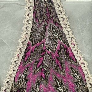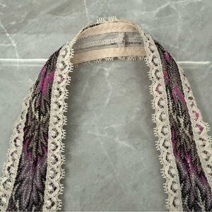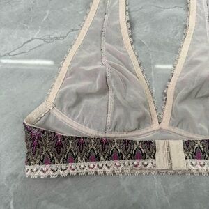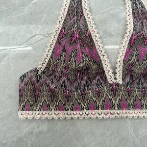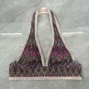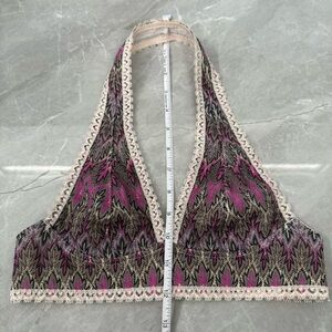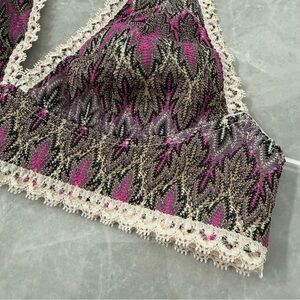 Good condition - Women’s Free People Boho Patterned Lace Halter Bralette Top. Has hook and eye closure with 3 settings. Colors: purple, pink, cream, brown, and gold. Size: XS.