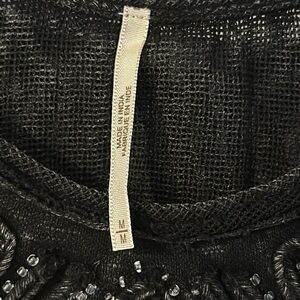 A short dress by Free People in dark faded gray, with raised textured seams forming spirals and geometric patterns on the bodice embellished with seed beads. Sleeveless, with a scoop neck. Square cutout in back. Fit-and-flare / skater silhouette, with a mini length gathered skirt