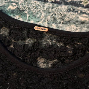 This is a pre-owned Free People black long-sleeve top. The top is made of lace material. It features a round neckline and long sleeves with a unique design at the cuffs. The top measures approximately 18 inches across the chest. There are some visible imperfections, including some loose threads and minor wear on the lace. The top is in overall good condition.