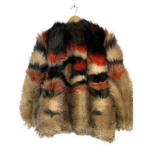 This Free People tribal-inspired faux fur jacket offers a bold statement with its rich blend of colors. Crafted with a mix of acrylic and polyester, this coat promises warmth and comfort. Its medium fit ensures a true-to-size appearance, ideal for adding flair to your winter wardrobe. Made in China with care instructions for dry cleaning.