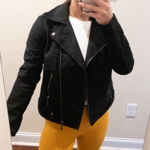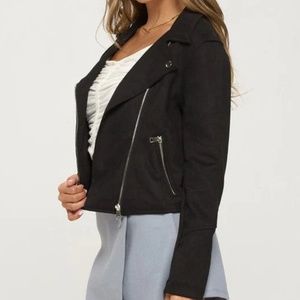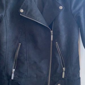 A gorgeous, lightweight fun Vegan suede Moto Jacket comes to you in black size xs. You will wear this with everything transforming it from a fun trendy daytime look to a date night out on the town look at you pair with those favorite jeans and booties. Accented by gunmetal tone hardware . Side zip pockets. Measurements bust 17”…length 20”