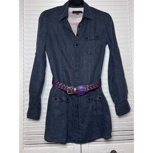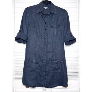 Women's French 100% Linen Navy Blue Roll Tab Sleeve Tunic Shirt Jacket Size Small