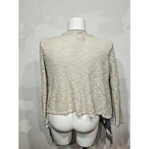 Description: Elevate your casual wardrobe with this stylish No Boundaries womens fringe knit open front draping cover up. Featuring a white base with black and grey patterns, this cover up is perfect for layering over your favorite outfits. The long sleeves and open front design provide a relaxed and elegant look, while the asymmetrical hem with fringe details adds a unique touch.