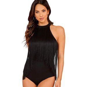 Women's Fringe Trim Rayon 10% Spandex Sleeveless Bodycon Halter Bodysuit