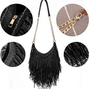 Women's Fringed Faux Suede Leather Cross Body Bag Chain Shoulder Bag Tassel Hand