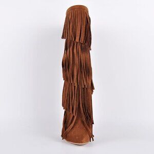 Pointed closed toe, fringed, pull-on, thin high heels, faux suede long boots