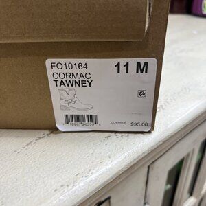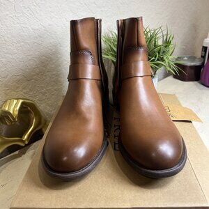 The product is a pair of women's Frye & Company Cormac Tawney Brown Moto Booties. These stylish booties feature a solid pattern, round toe shape, zip closure, and a stacked heel style. Made from faux leather with a polyester lining, they are designed for casual and travel occasions during the winter, fall, and spring seasons. The booties also include accents like a buckle and zipper, and offer features such as being cushioned, slip resistant, and lined for added comfort.