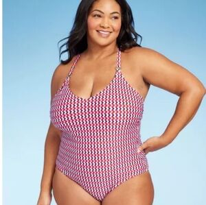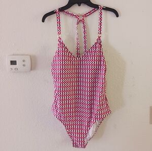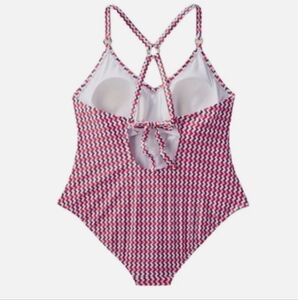 Features full coverage, stretchy fabric, modern geometric pattern, metal ring accents sewn-in cups, crisscross back with a tie closure for right fit.