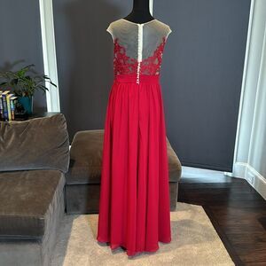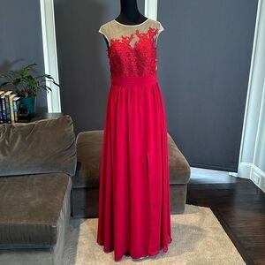 Women’s Full Length Red Chiffon & Lace Appliqué Formal Dress with a Zip Up Back and Front Leg Slit