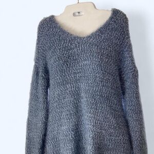 Blue sweater with a fuzzy texture, featuring a V-neck and long sleeves So S