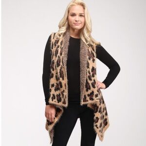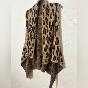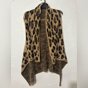 Women’s Fuzzy Leopard Print Open Front Handkerchief Hem Sweater Vest Sz Medium