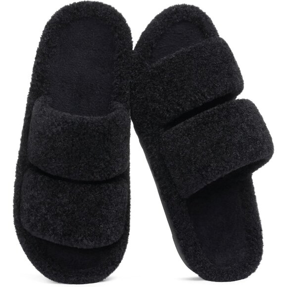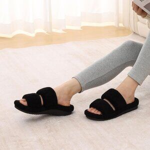 Women's Fuzzy Moderate Arch Support Open Toe Cozy Bedroom Black Slippers Shoes