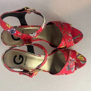 Worn but in good shape. Womens G by GUESS Cenikka Platform Ankle Strap Sandals - Red Multi Toe-Shape: Peep-Toe
