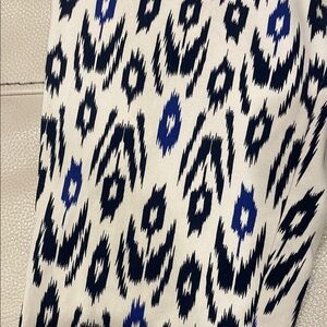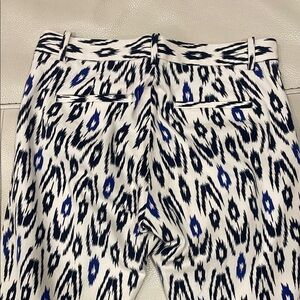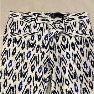 Trendy cropped pants with bold black and blue pattern. Pants sit at ankles